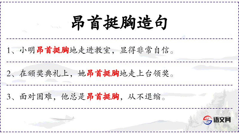 - 昂首挺胸:成语,形容人抬头挺胸,显得自信或自豪。