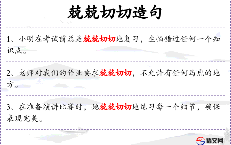 - 兢兢切切:副词,形容非常小心谨慎的样子。