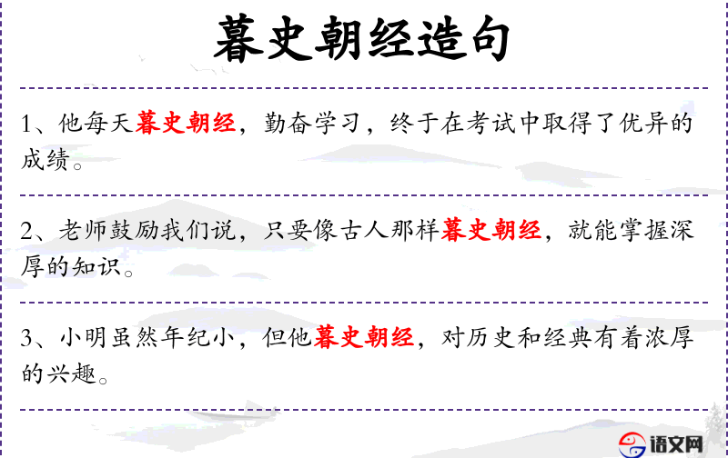 2. 【暮史朝经】 - 史:指历史书籍;经:指旧时奉为经典的书籍。一天到晚诵读经史。形容勤奋读书。