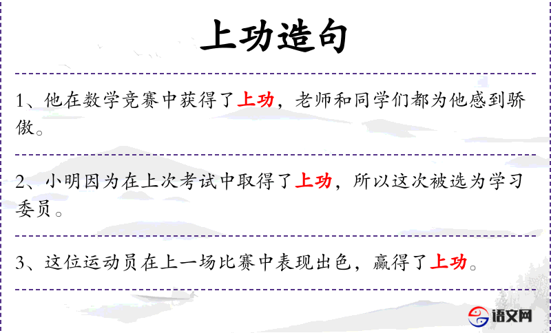 1. 【上功】 - 最高的功绩; 崇尚劳作或功绩。上,通"尚"。