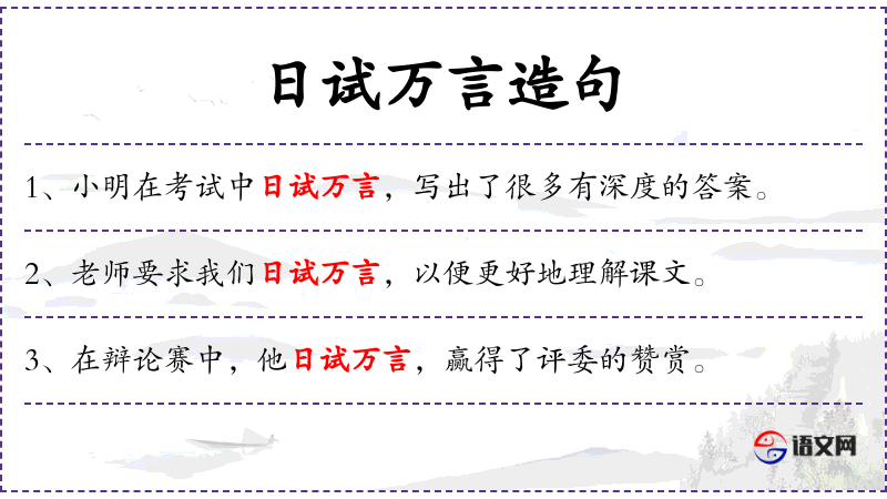 句子:“她写作时总是日试万言,每一篇文章都充满了思考和见解。”