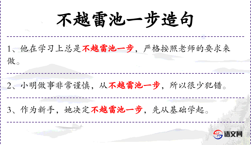 1. 【不越雷池一步】 - 雷池:湖名,在安徽省望江县南。不敢越过界限,形容拘谨。