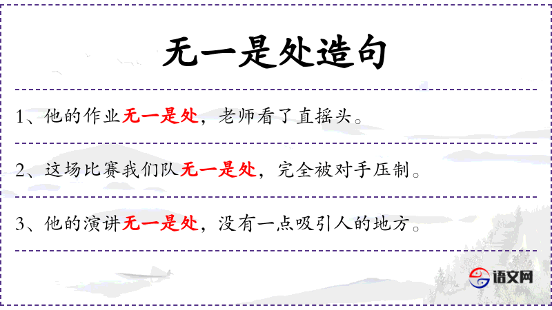 - 第一个分句没有明确的宾语,因为“无一是处”是一个形容词短语,表示状态。