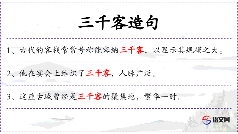 1. 【三千客】 - 形容门客众多。战国齐孟尝君﹑魏信陵君﹑赵平原君﹑楚春申君四公子皆喜养士,门下号称有食客三千人。见《史记》四公子本传。