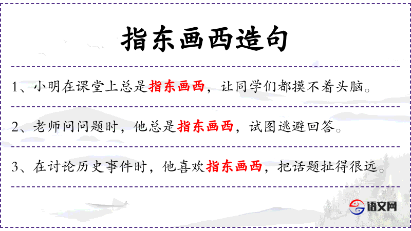 - 成语:指东画西,源自**传统文化,形容说话或做事没有条理。
