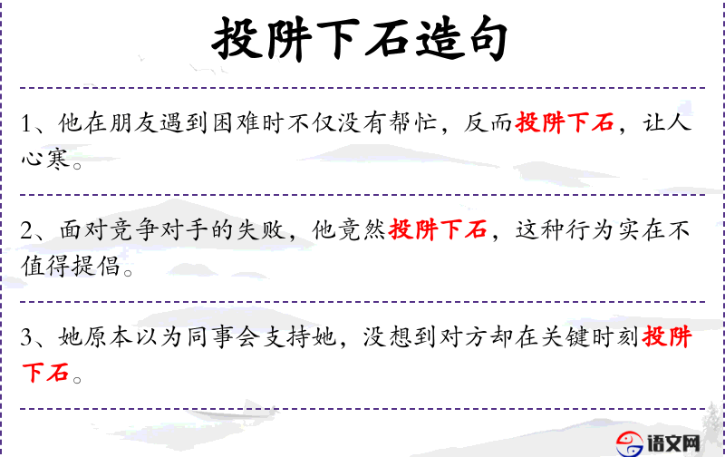 - 典故:源自**古代的一个故事,讲述一个人在另一个人掉进井里时,不仅不帮忙,反而扔石头。