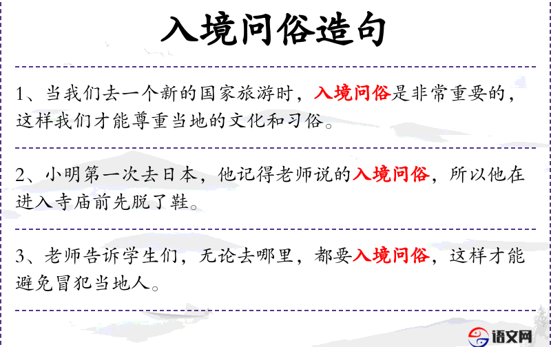 - 入境问俗:成语,意思是到了一个新的地方,就要了解和遵守当地的*俗和规矩。
