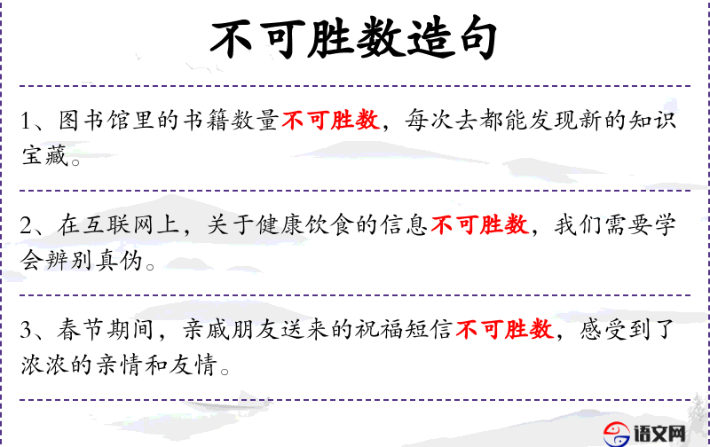 - 不可胜数:形容数量非常多,无法数清。