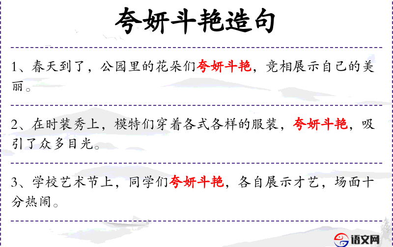 - 谓语:夸妍斗艳、赢得