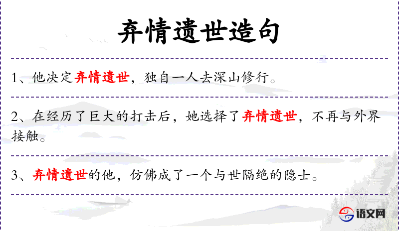 - 弃情遗世:放弃情感,远离世俗。形容人超脱世俗,不问世事。