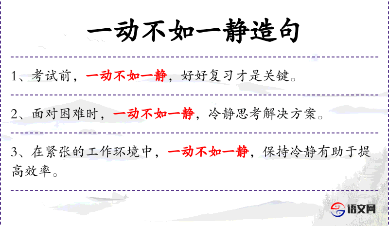 - 一动不如一静:这是一个成语,意思是说在某些情况下,行动不如静止,即保持冷静和稳定比盲目行动更为重要。