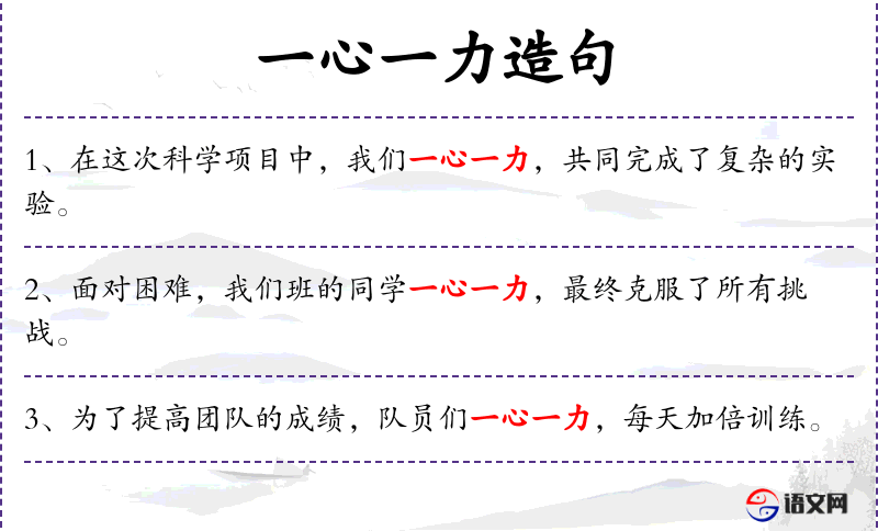 - 一心一力:形容大家齐心协力。