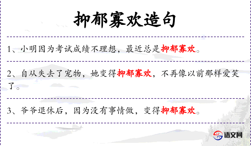 - 抑郁寡欢:形容词短语,表示情绪低落、不快乐。