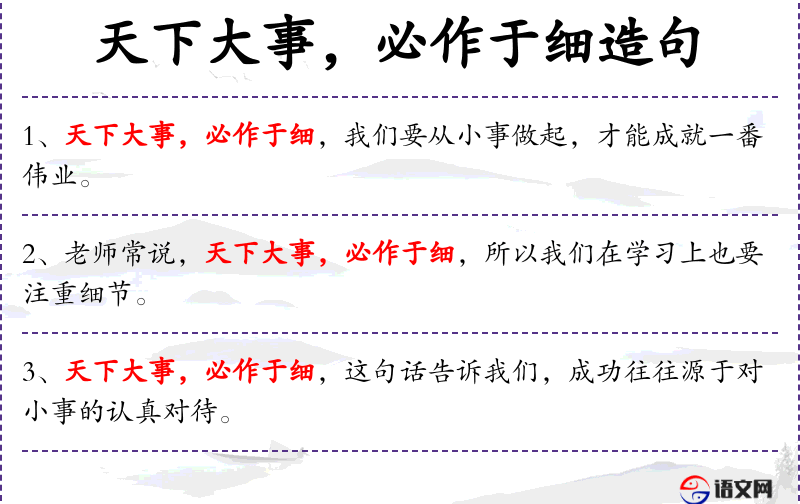 句子:“天下大事,必作于细,这句话告诉我们,伟大的成就往往建立在无数细小工作的基础上。”