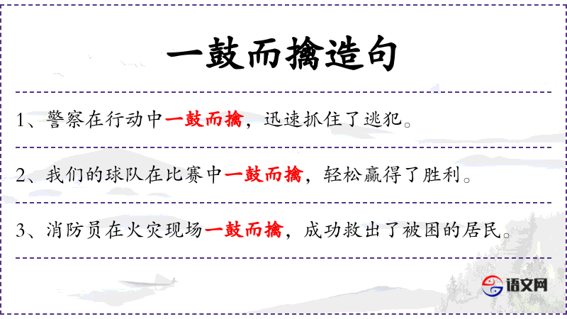 - “一鼓而擒”源自古代战争中的战术,比喻迅速解决问题。