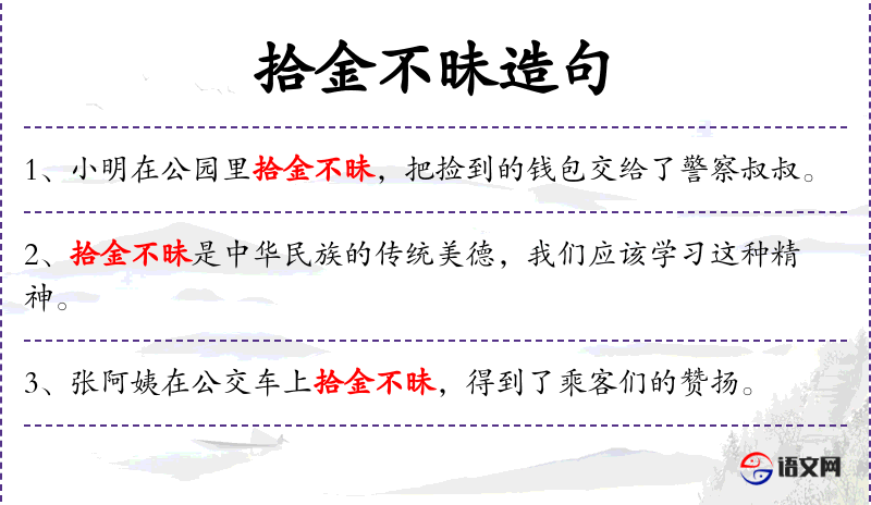 - 拾金不昧:成语,意思是捡到钱财不隐藏,而是归还给失主。