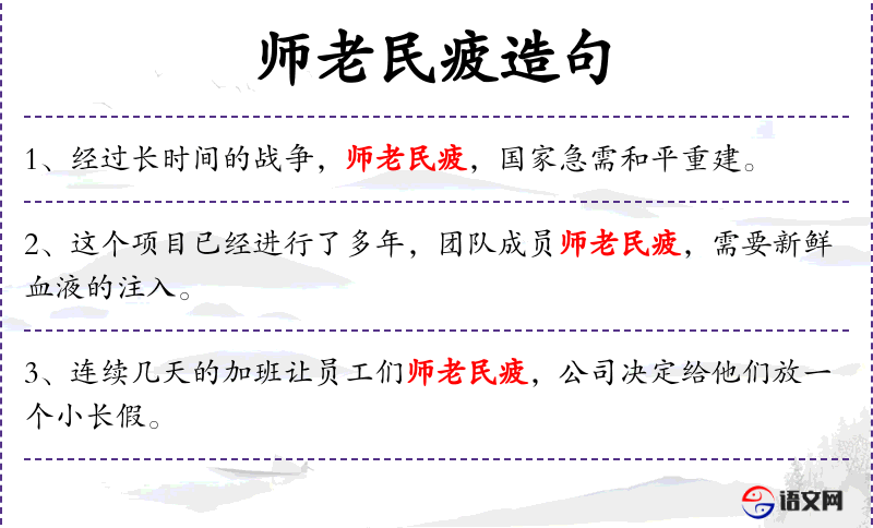 1. 【师老民疲】 师:军队;老:衰竭;民:民众;疲:疲乏。部队士气衰落,百姓疲惫不堪。形容连年征战造成士兵、人民极其疲劳。