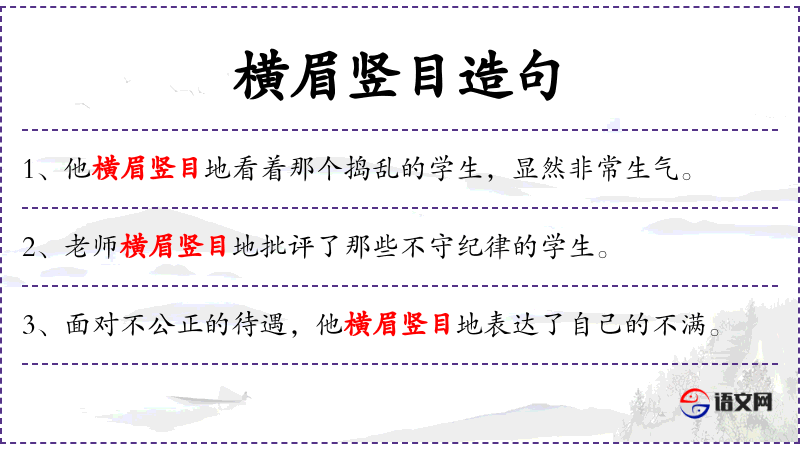 3. 【横眉竖目】 - 指耸眉瞪眼,形容怒目相视,态度凶狠的样子。