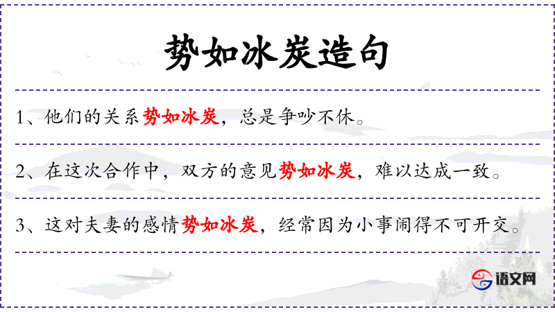 - 势如冰炭:形容关系极度对立,如同冰和炭一样不能相容。
