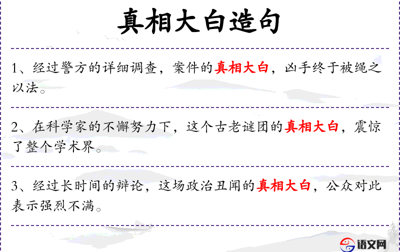 6. 【真相大白】 大白:彻底弄清楚。真实情况完全弄明白了。