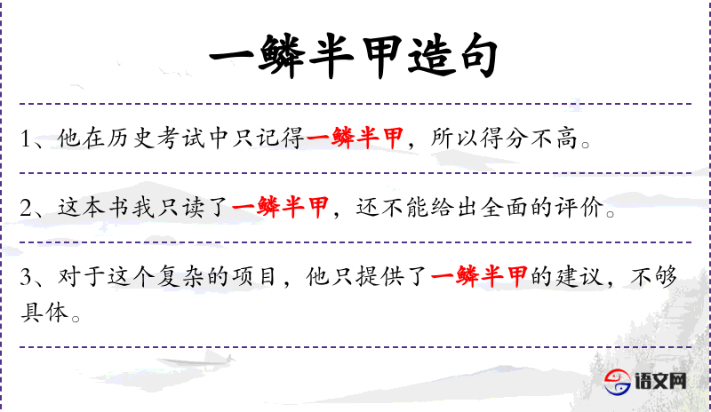 1. 【一鳞半甲】 原指龙在云中,东露一鳞,西露半爪,看不到它的全貌。比喻零星片段的事物。