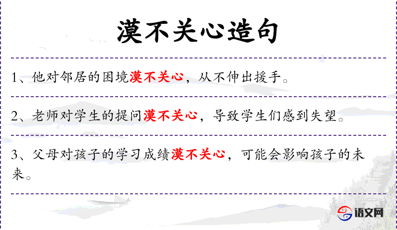 5. 【漠不关心】 - 漠:冷淡。态度冷淡,毫不关心。