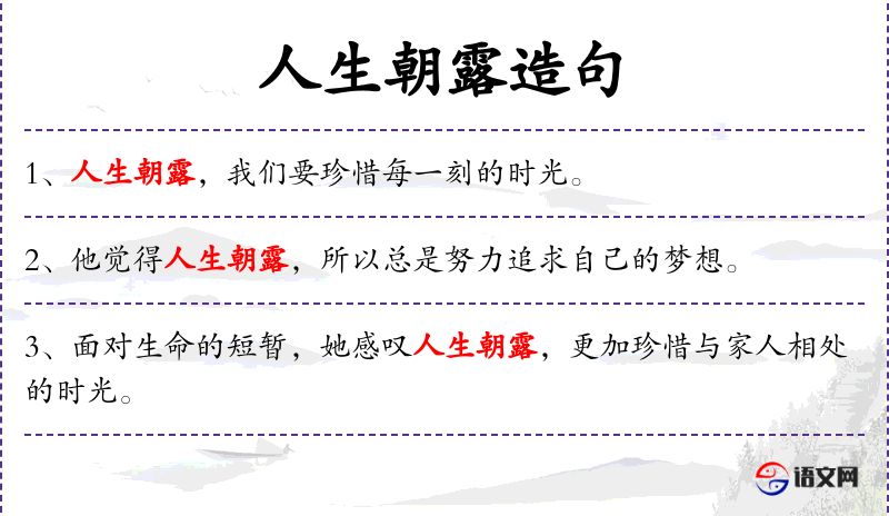 - 人生朝露:比喻人生短暂,如同早晨的露水一样易逝。