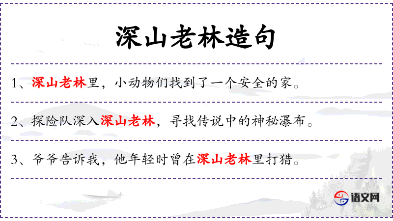 1. 【深山老林】 - 与山外、林外距离远的、人迹罕至的山岭、森林。
