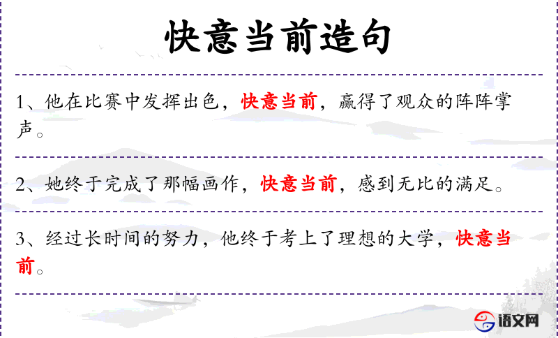- 快意当前:表示目前感到非常满意和快乐。 *. 充满了:表示充满某种情感或物质。