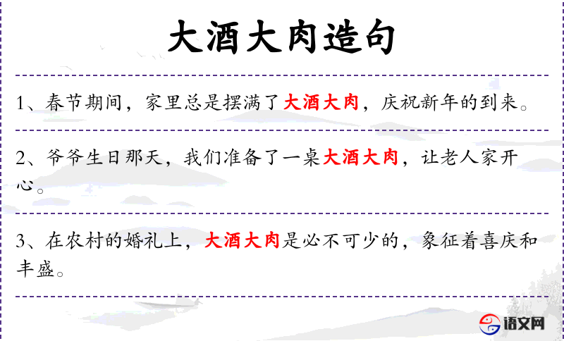 - 大酒大肉:丰盛的酒菜,形容宴会的丰盛。
