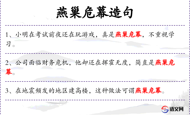 1. 【燕巢危幕】 - 燕子把窝做在帷幕上。比喻处境非常危险。