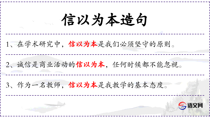 1. 【信以为本】 信:诚实。以诚实可信作为处世的根本。指言行要遵守信用。