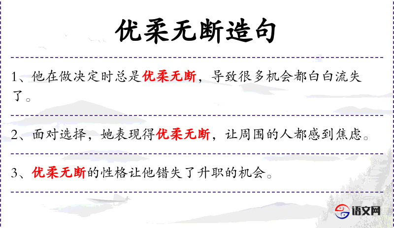 - 优柔无断:形容一个人犹豫不决,缺乏果断。