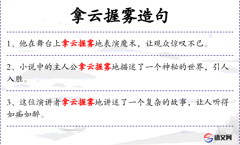 - 文化背景:在**文化中,“拿云握雾”常用来形容技艺高超,难以捉摸,体现了对技巧的赞美。
