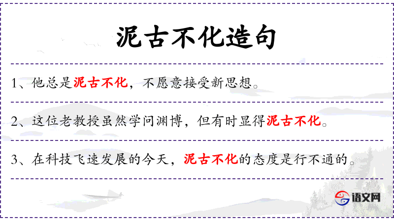 1. 【泥古不化】 - 泥:拘泥,固执。拘泥于古代的成规或古人的说法而不知变通。