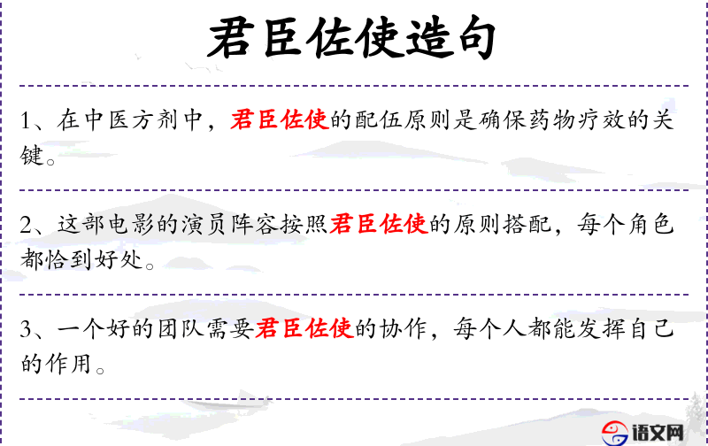 - 君臣佐使:源自**古代政治体制,强调君主与臣子之间的相互配合和职责分工。在现代语境中,这一成语被用来比喻任何组织或团队中成员间的协作。