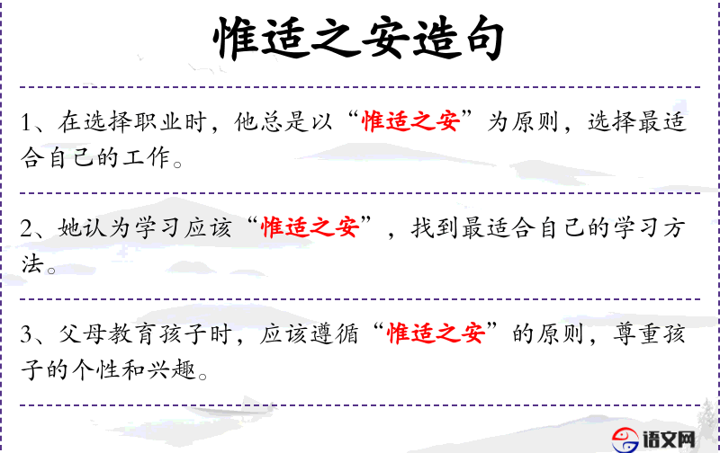 - 惟适之安:这是一个成语,意思是只选择最适合自己的方式来达到安定或舒适。
