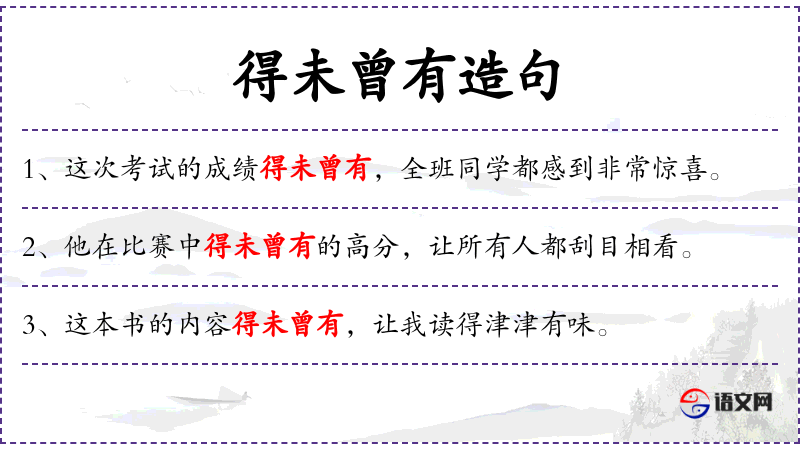 在翻译中,“得未曾有”被翻译为“unprecedented”(英文)、“未曾有”(日文)和“beispiellos”(德文),都准确地传达了原句中强调的“前所未有”的含义。