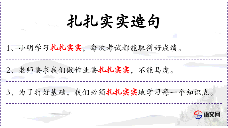 - 扎扎实实:形容词,表示稳固、实在、不虚浮。
