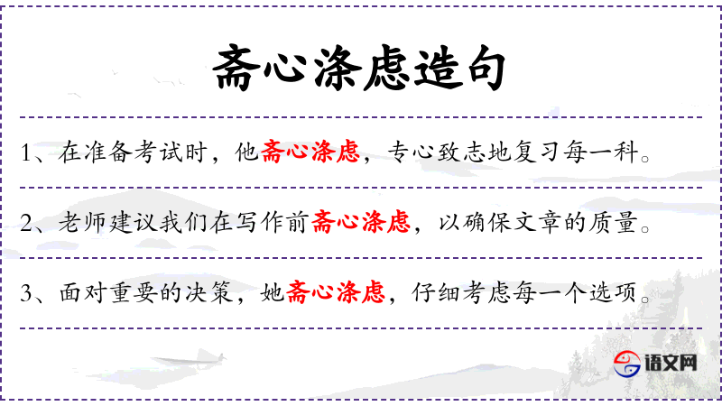 - 斋心涤虑:这个词组意味着非常认真和专注地思考,通常用于描述在做出重要决策时的精神状态。