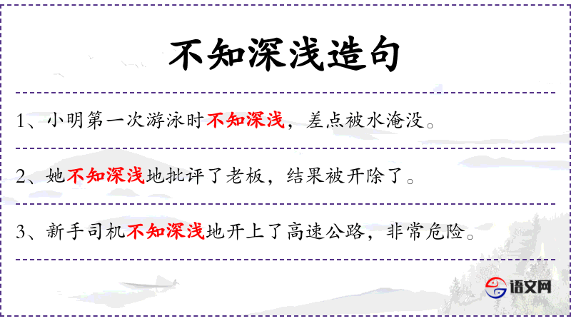 1. 【不知深浅】 - 原意是不知道水的深浅。后多用以形容不懂得事情的利害。