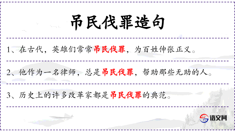 - 吊民伐罪:成语,意为伸张正义,惩罚罪恶。