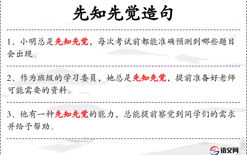 1. 【先知先觉】 知:认识;觉:觉悟。指认识事理较一般人为早的人。