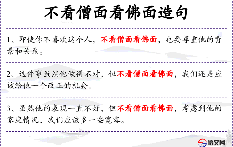 - 不看僧面看佛面:这个成语源自**文化,强调在处理人际关系时,即使不看重某人本身,也要考虑到其背后的影响力或关系。