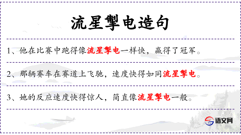 1. 【流星掣电】 - 比喻迅疾。同“流星飞电”。