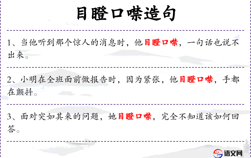 1. 【目瞪口噤】 - 目瞪:睁大眼睛直视;口噤:嘴里说不出话来。形容因吃惊或害怕而发愣的样子。