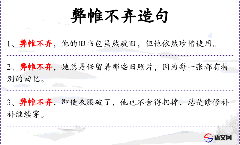 句子:“[弊帷不弃,即使衣服破了,他也不舍得扔掉,总是修修补补继续穿。]”