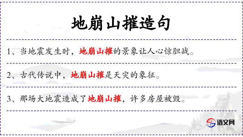 - 地崩山摧:形容地震时地面崩裂、山体崩塌的景象,是一个成语,用来强调地震的破坏力。