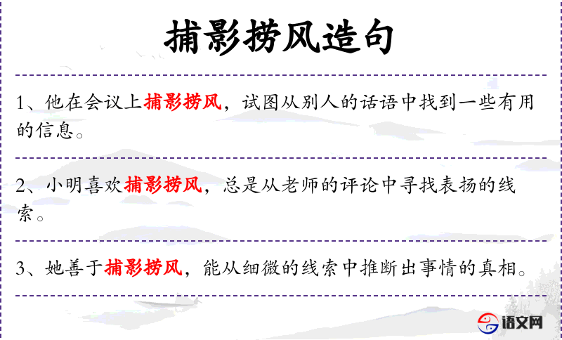 - 英文:使用了“fishing for clues”来表达“捕影捞风”的意思,形象地描述了寻找信息的行为。