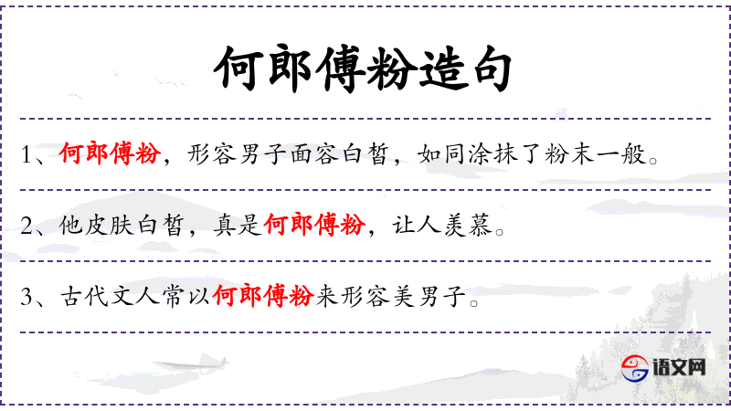 - 何郎傅粉:成语,源自《世说新语》,比喻男子美貌。何郎指何晏,傅粉指涂粉。